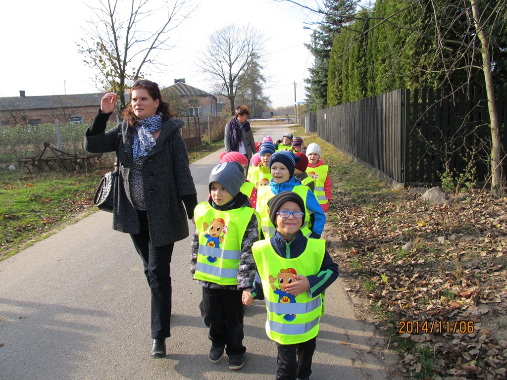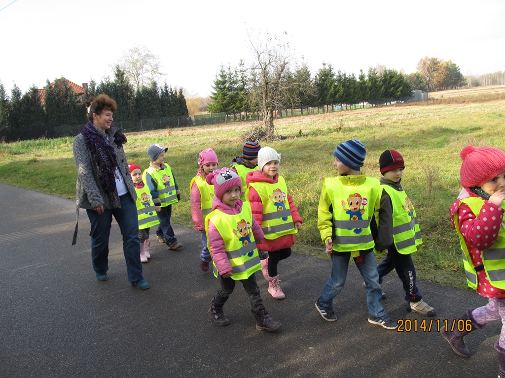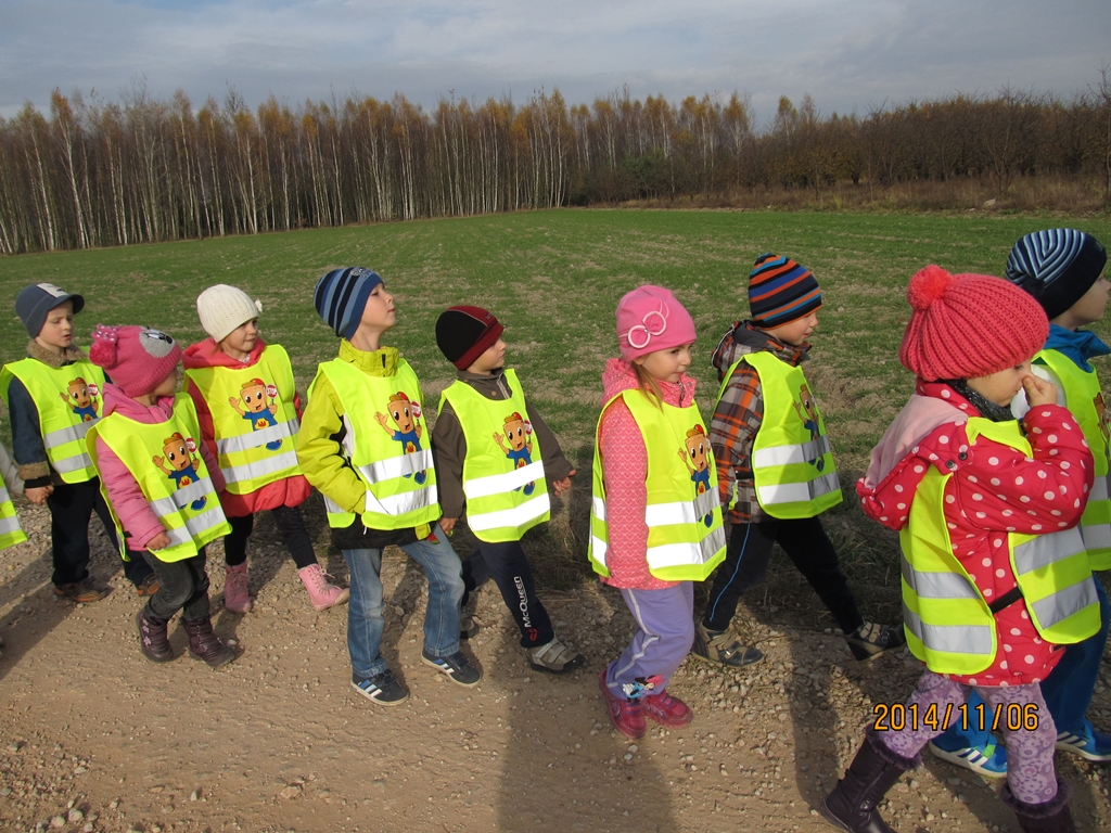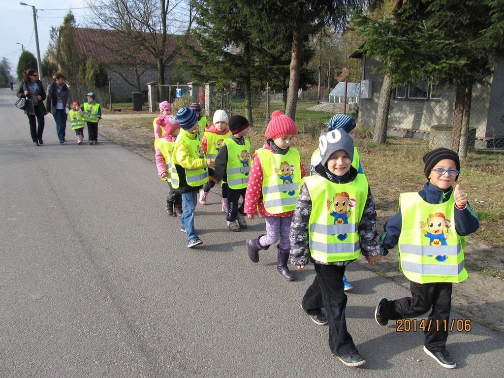 Tegoroczna jesień jest wyjątkowo ciepła i dlatego właśnie 06.11 dzieci z oddziału przedszkolnego wybrały się na wycieczkę w celu poznania najbliższej okolicy. Podczas takiego spaceru dzieci nie tylko poznają okolice, podziwiają uroki jesieni, ale także uczą się właściwych wzorców zachowań. W celu zwiększenia bezpieczeństwa na spacerze przedszkolaki ubrane były w "uśmiechnięte" odblaskowe kamizelki.