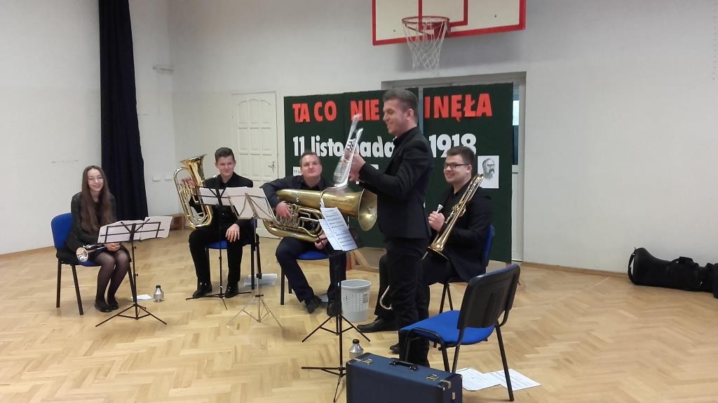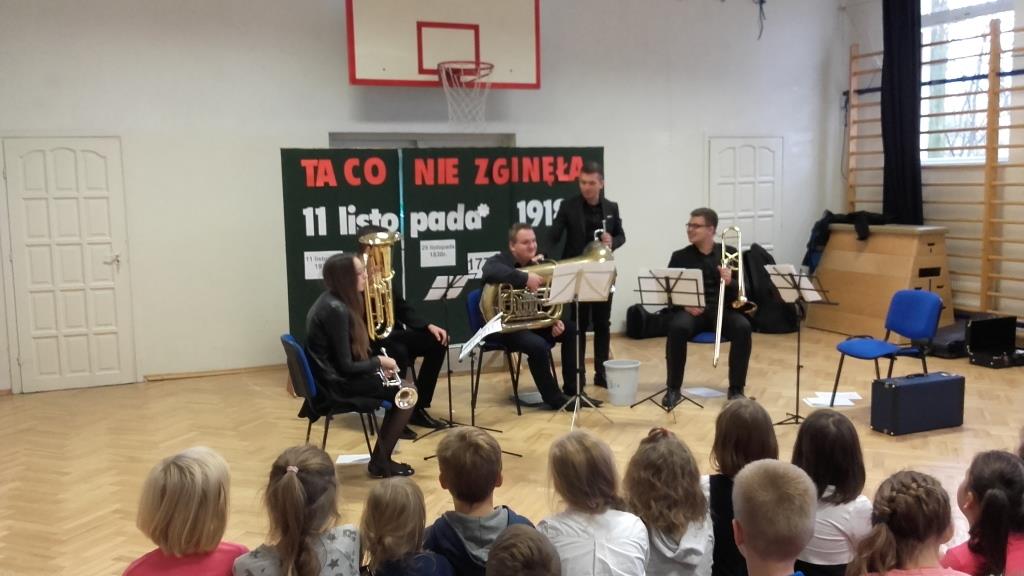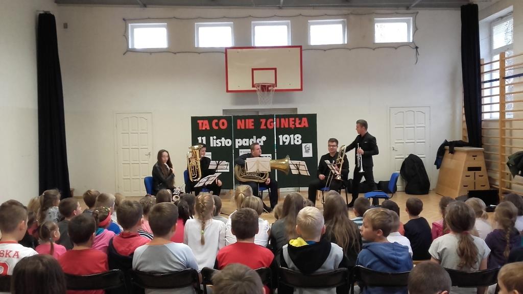 Tego samego dnia uczniowie mieli okazję wysłuchać koncetru w wykonaniu muzyków grających na instrumentach dętych. Nawet najmłodsi wykazali się znajomością takich utworów jak: "My, Pierwsza Brygada", "Piechota", "Pierwsza Kadrowa", "Wojenko, wojenko" czy "Przybyli ułani pod okienko". Bez trudu odgadywali tytuły utworów i śpiewali je z towarzyszeniem instrumentów. Była to także okazja do zapoznania się z budową, wskazaniem różnic i podobieństw tych instrumentów.