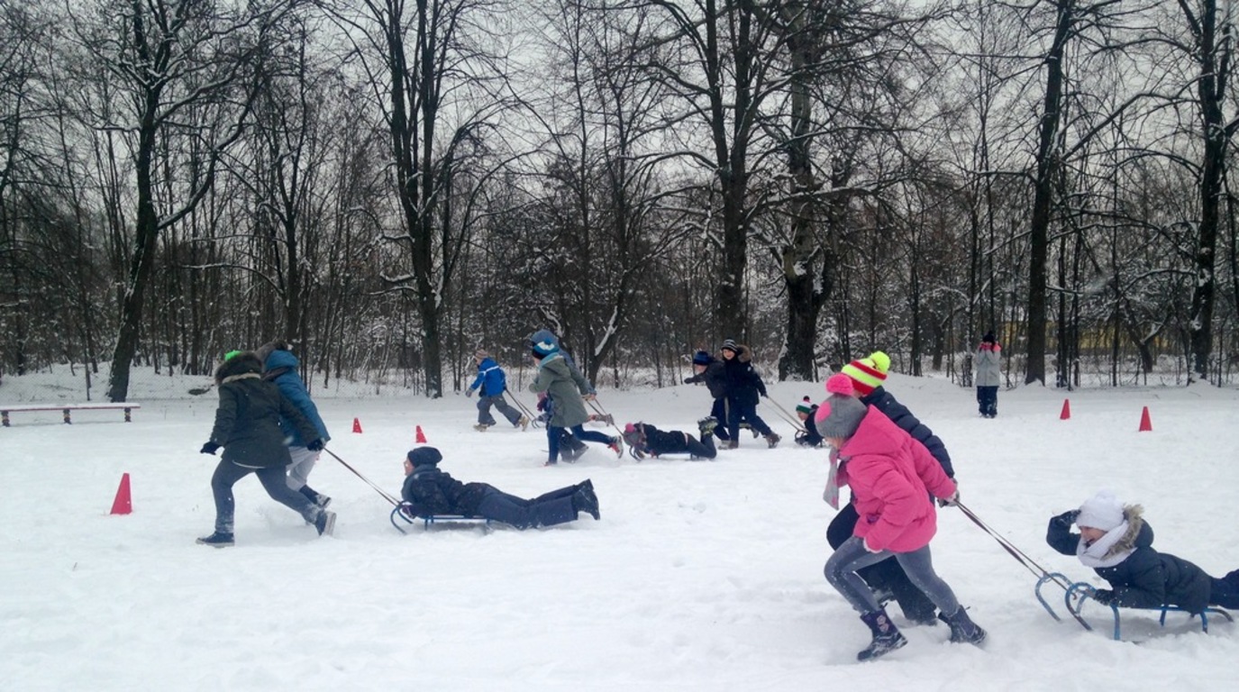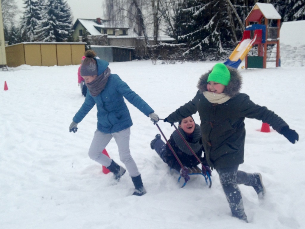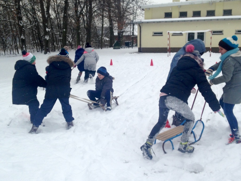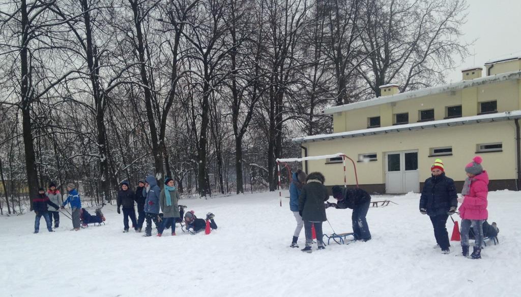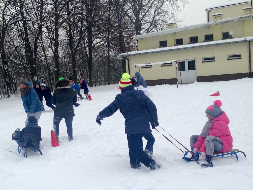 Korzystając z uroków zimy uczniowie klasy IV i V w ramach zajęć w-f, spędzili zajęcia na świeżym powietrzu wykorzystując szkolne sanki.