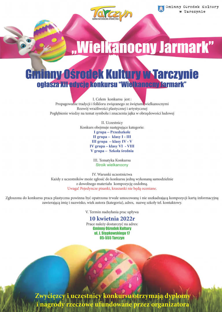 Zapraszamy do udziału w konkursie plastycznym.Gminny Ośrodek Kultury w Tarczynie ogłasza XII edycję konkursu “Wielkanocny Jarmark”