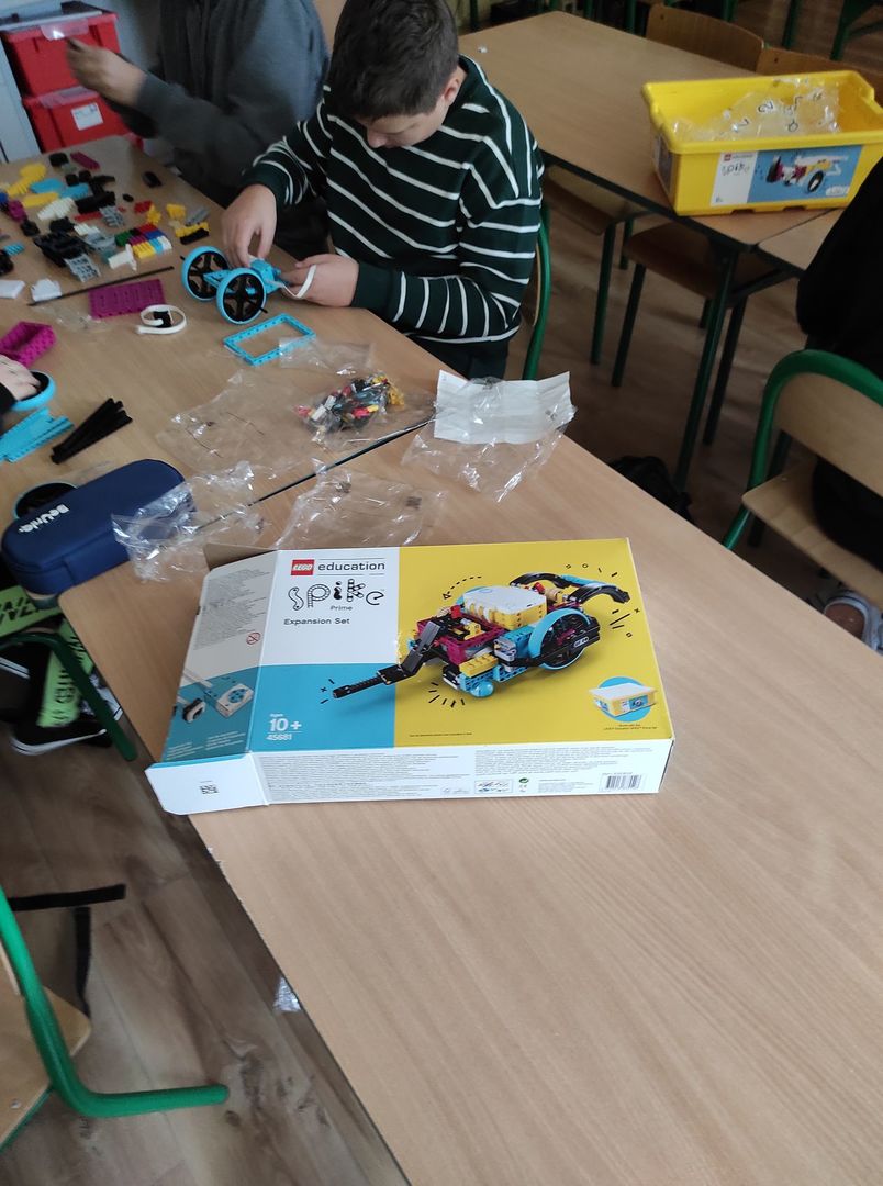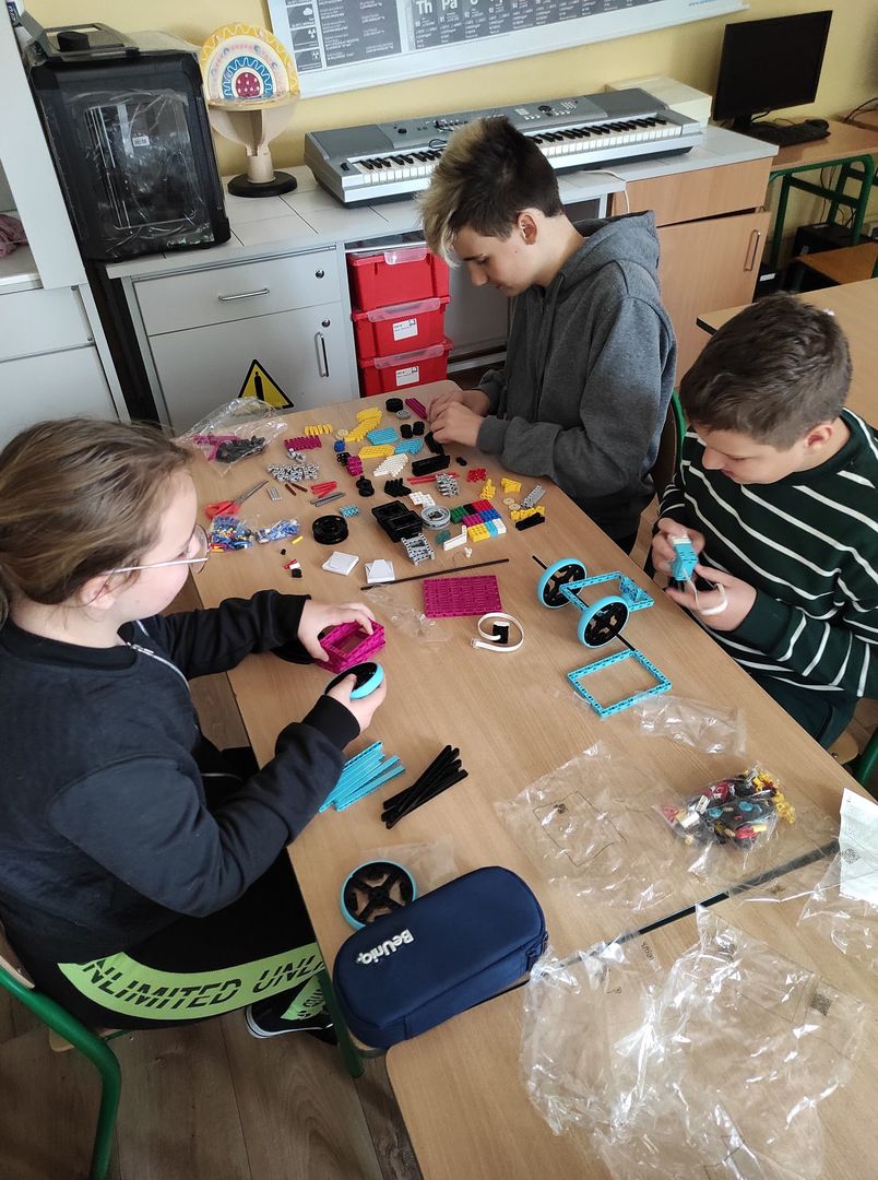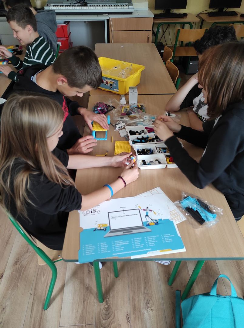 Uczniowie klasy 7 wcielili się w role konstruktora wykorzystując w swojej pracy klocki LEGO Spike otrzymane w ramach projektu Laboratorium Przyszłości.